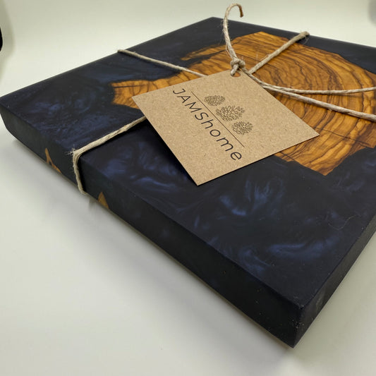 Olive Wood Live Edge Layered Deep Sea Blue Swirl, Charcuterie Board. 8”x8”