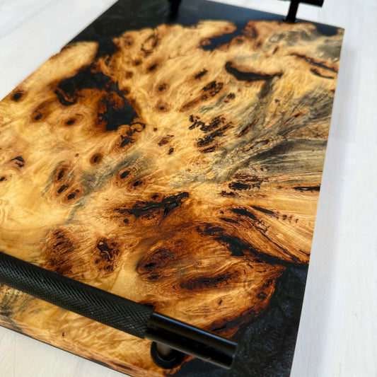 Exotic Buckeye Burl Live Edge Charcuterie/Server Wrapped w/ Black Diamond Swirl. Black Matte Knurled Handles