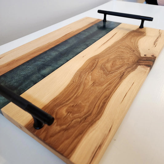 Natural Rustic Hickory Live Edge w/ Lux Emerald Green Swirl & Black Industrial Nickel Handles Charcuterie Board
