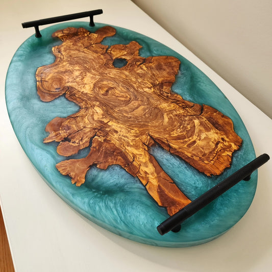 Chunky Live Edge Oval Olive Wood Charcuterie w/ Caribbean Blue Swirl