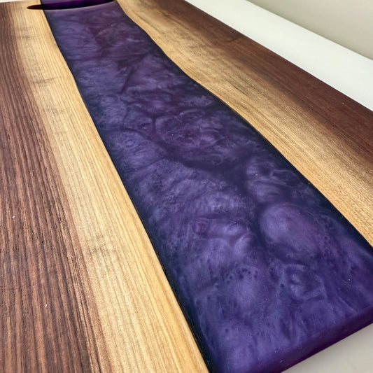 Double Sided Black Walnut & Golden Purple Rain Swirl Charcuterie. Natural Routed Handle