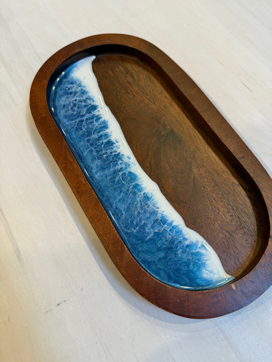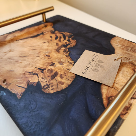 Olive Wood Live Edge Layered Deep Sea Blue Swirl, Chunky Charcuterie Board.