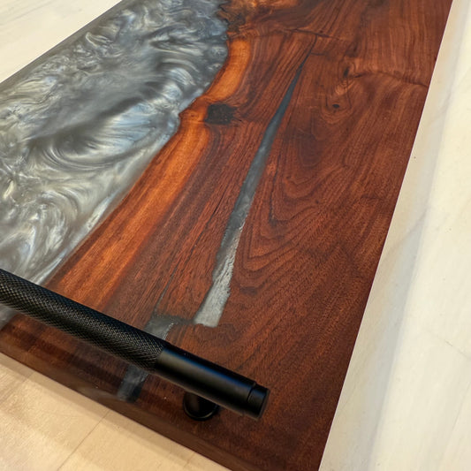 Supersized 12”x24” Black Walnut & Aluminum Swirl Charcuterie w/ Industrial Black Gnarled Handles.