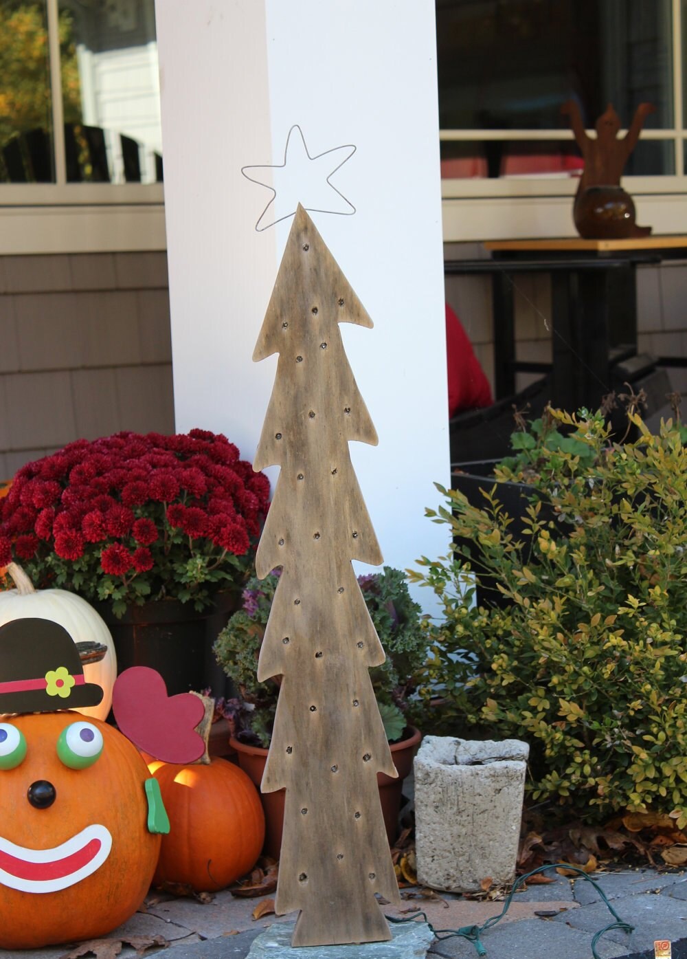 This Hand Cut, Weathered wood Christmas Tree is full of details. Plug in or Battery Timed LED