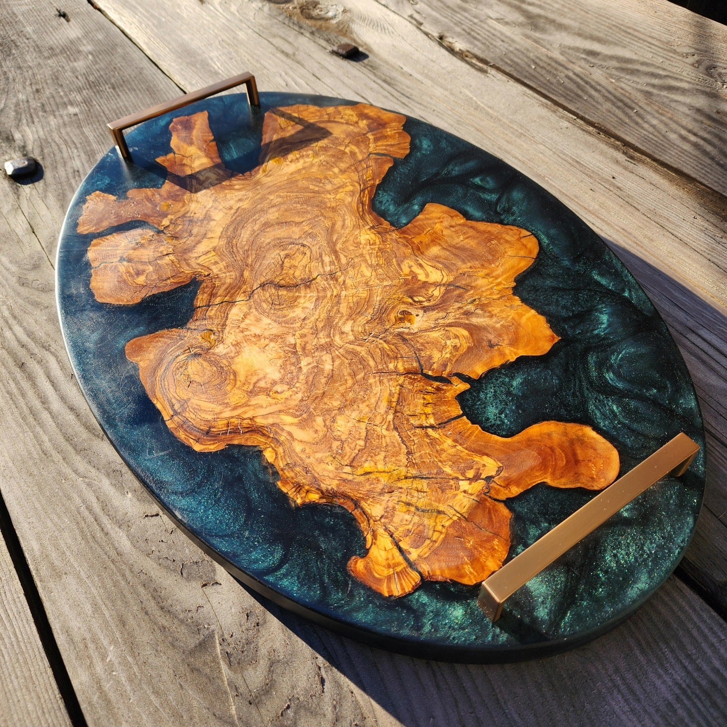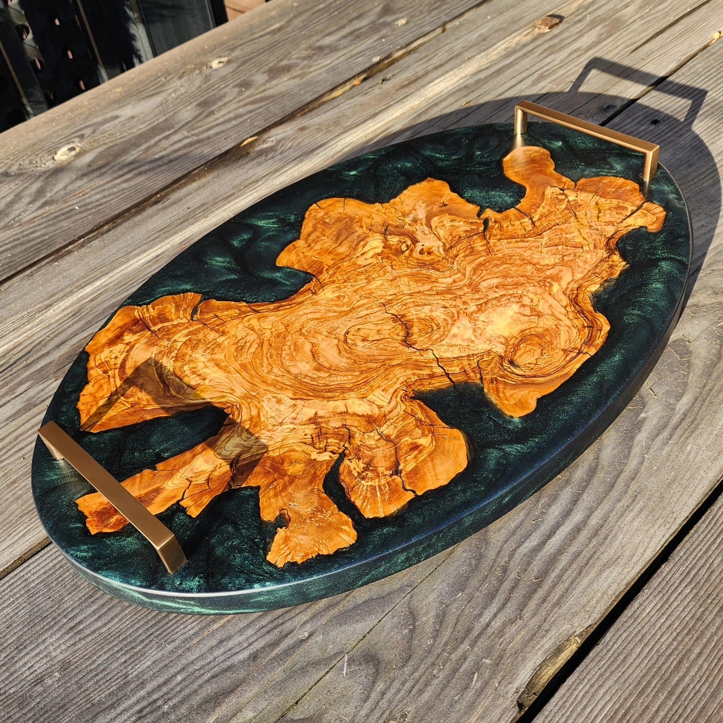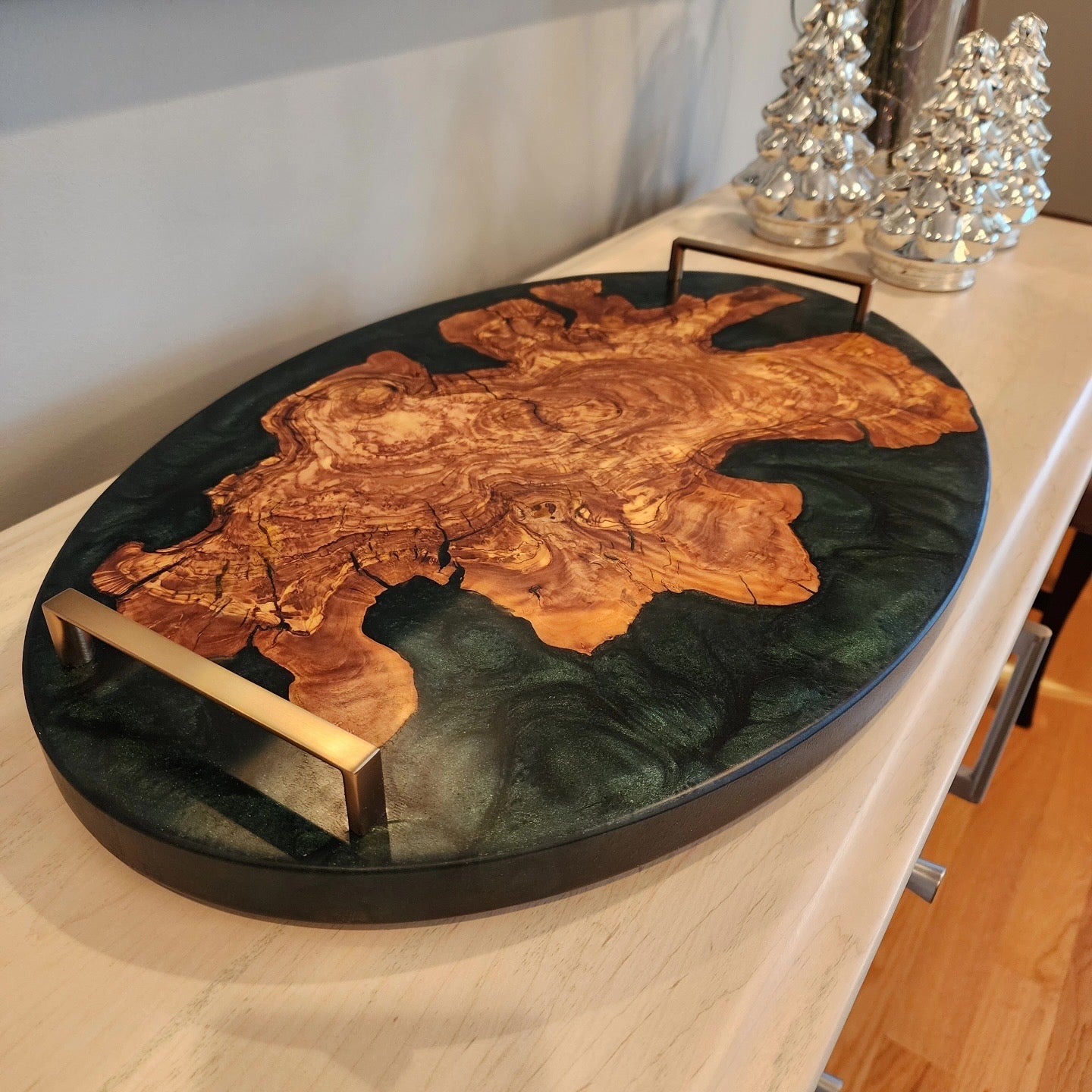 Chunky Live Edge Oval Olive Wood Charcuterie w/ Deep Green Swirl