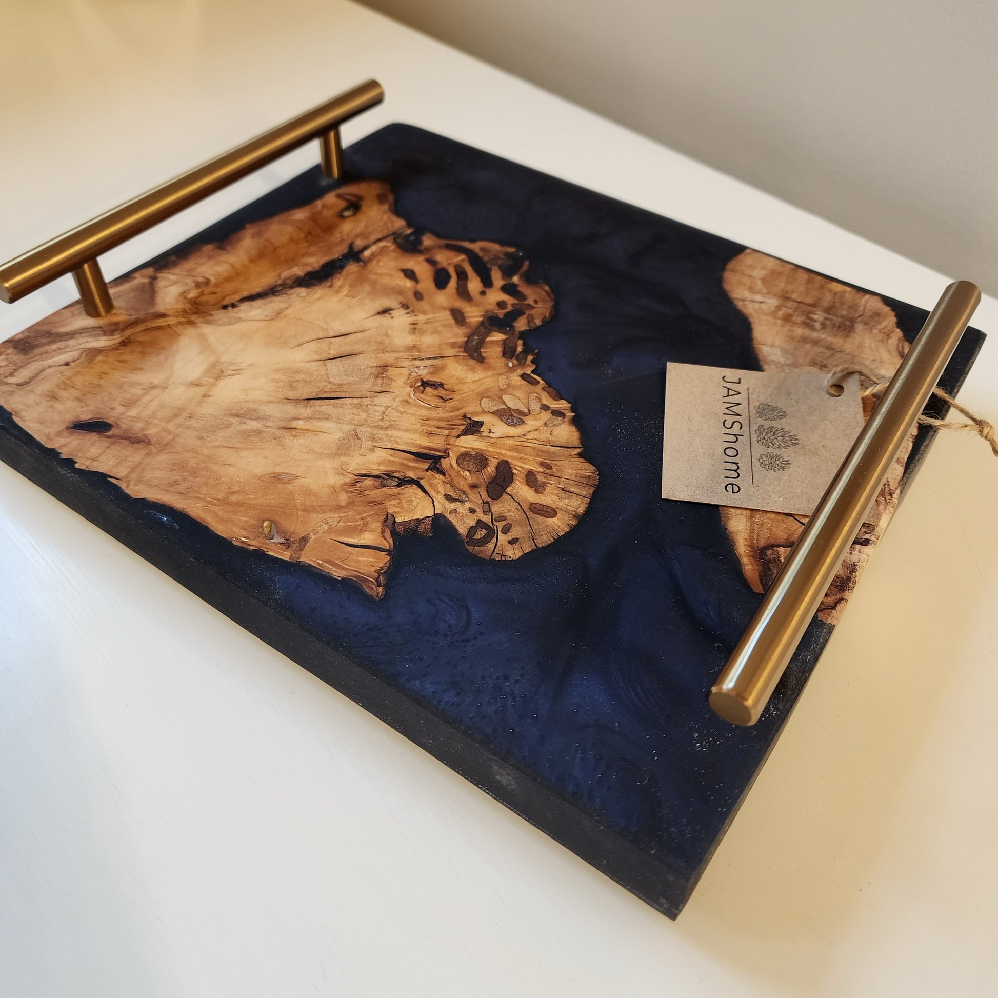 Olive Wood Live Edge Layered Deep Sea Blue Swirl, Chunky Charcuterie Board.