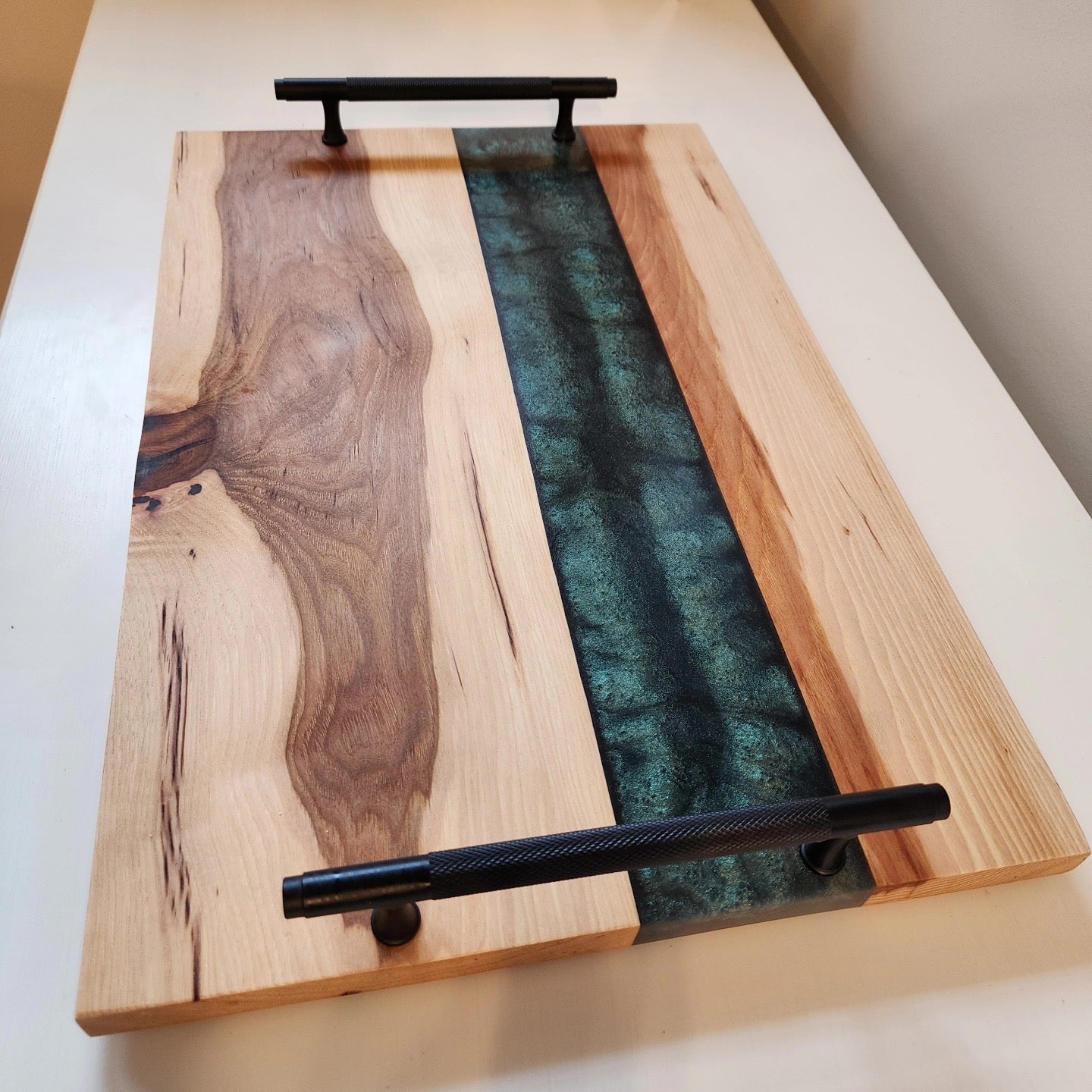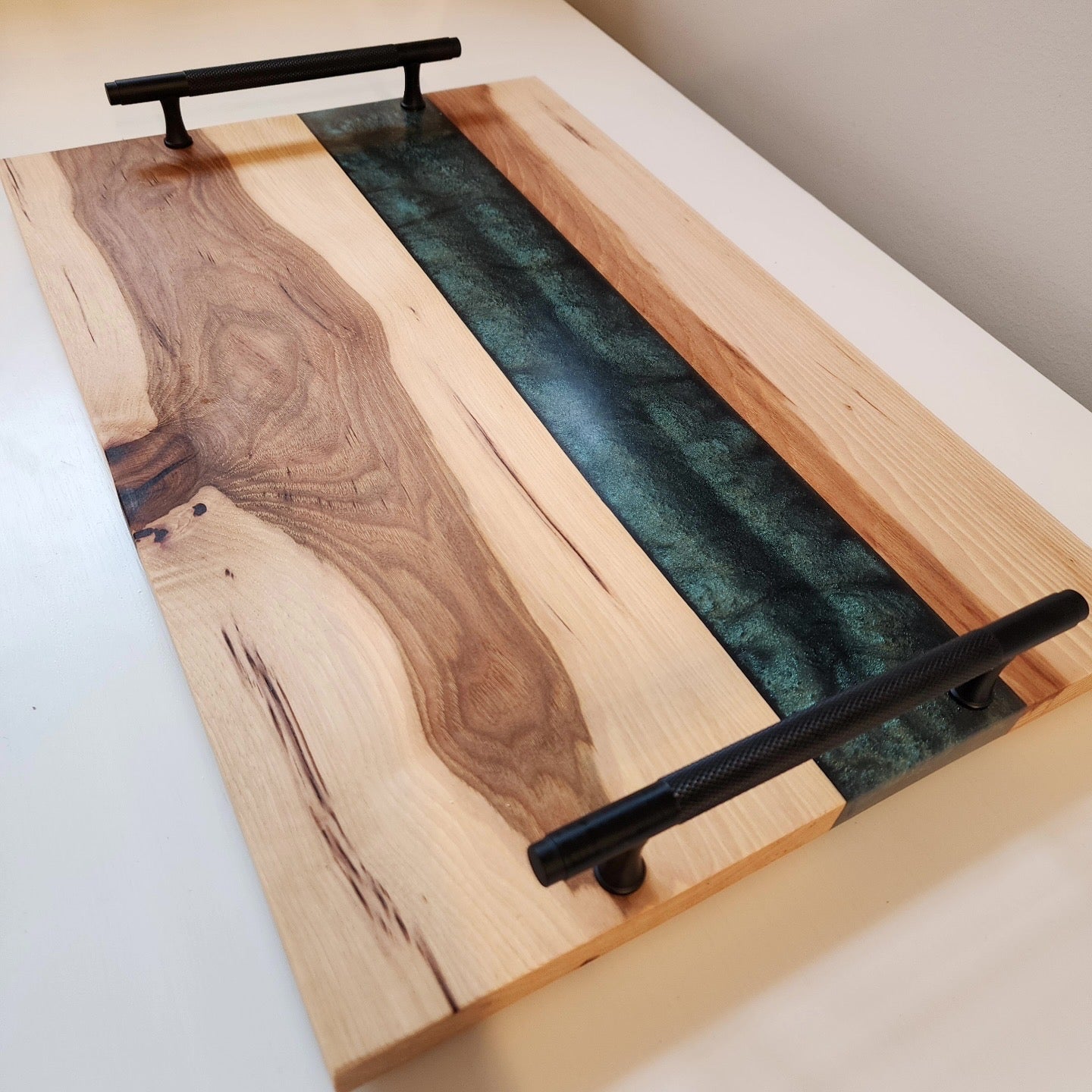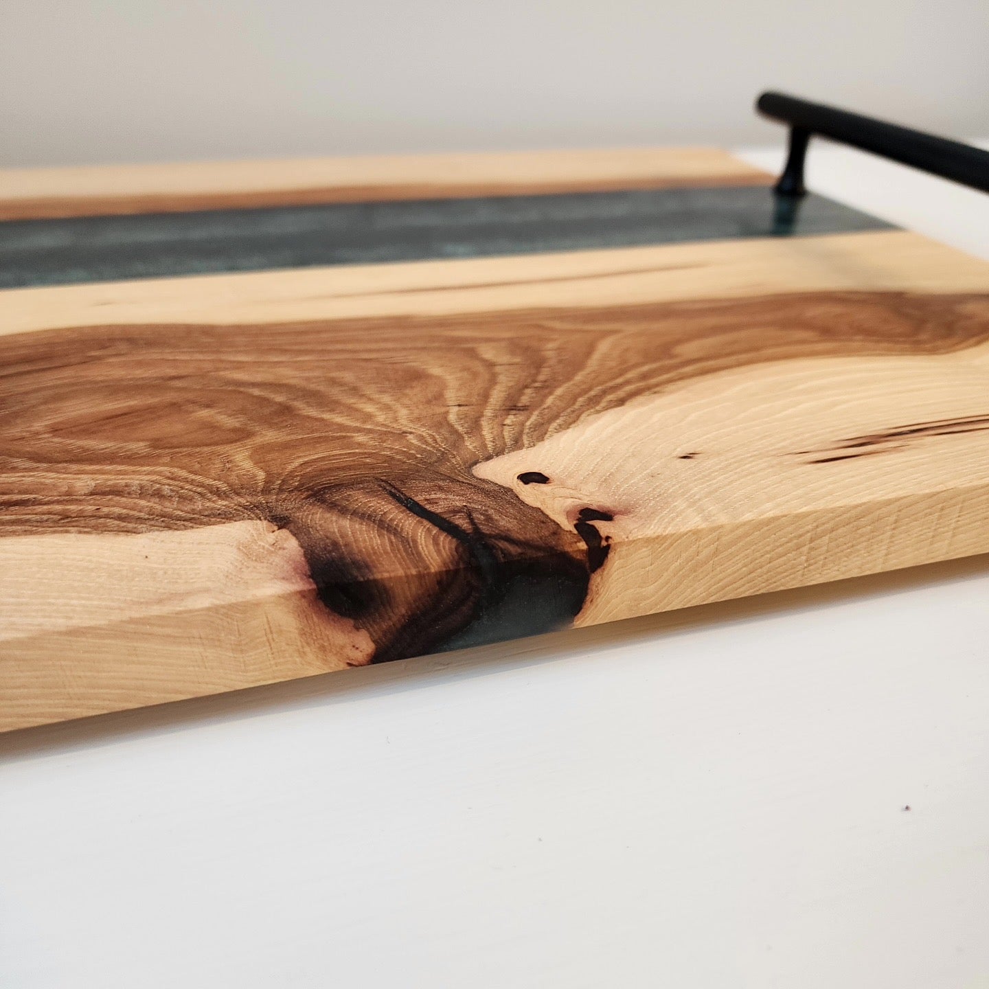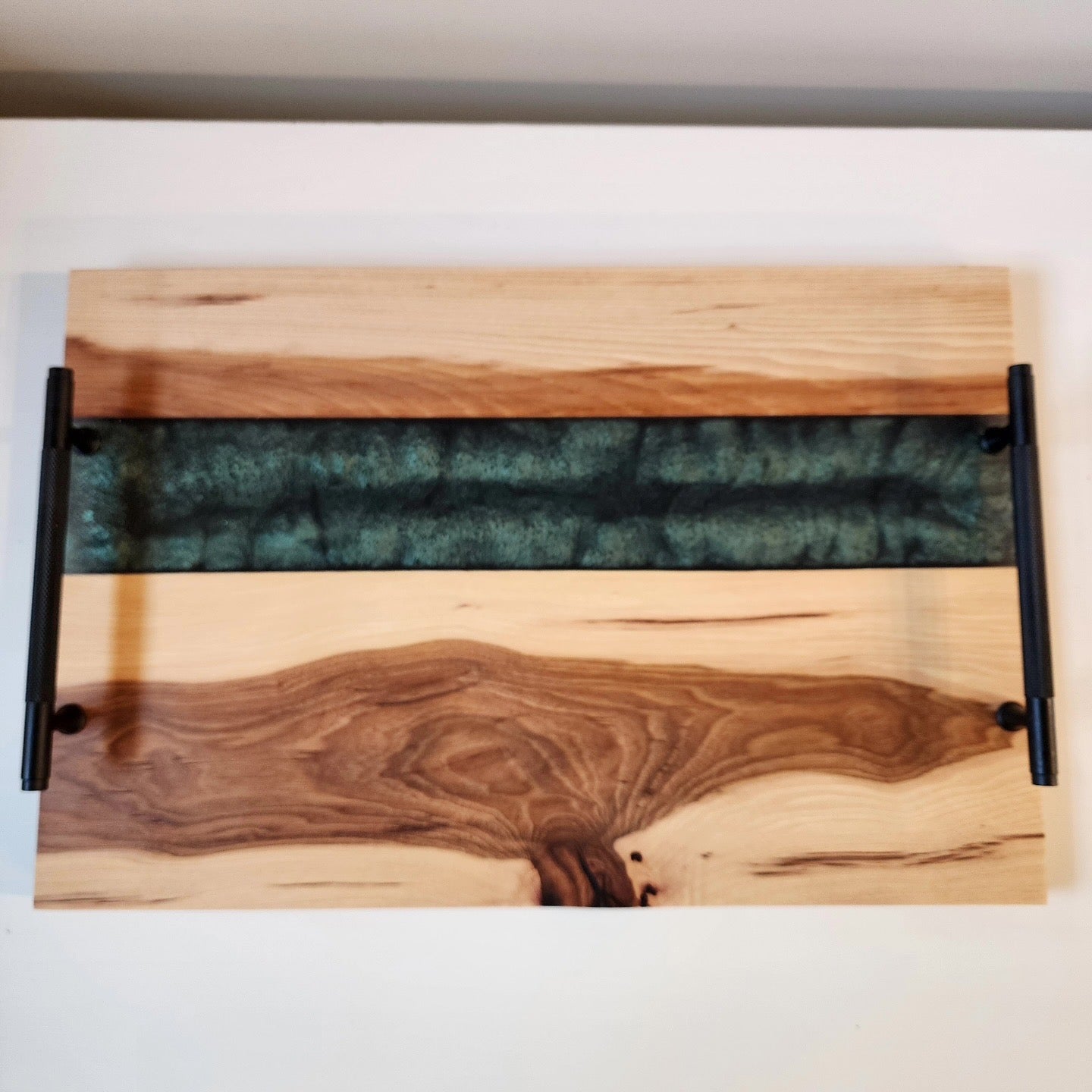 Natural Rustic Hickory Live Edge w/ Lux Emerald Green Swirl & Black Industrial Nickel Handles Charcuterie Board