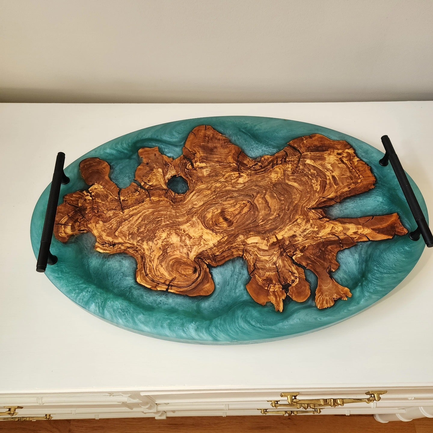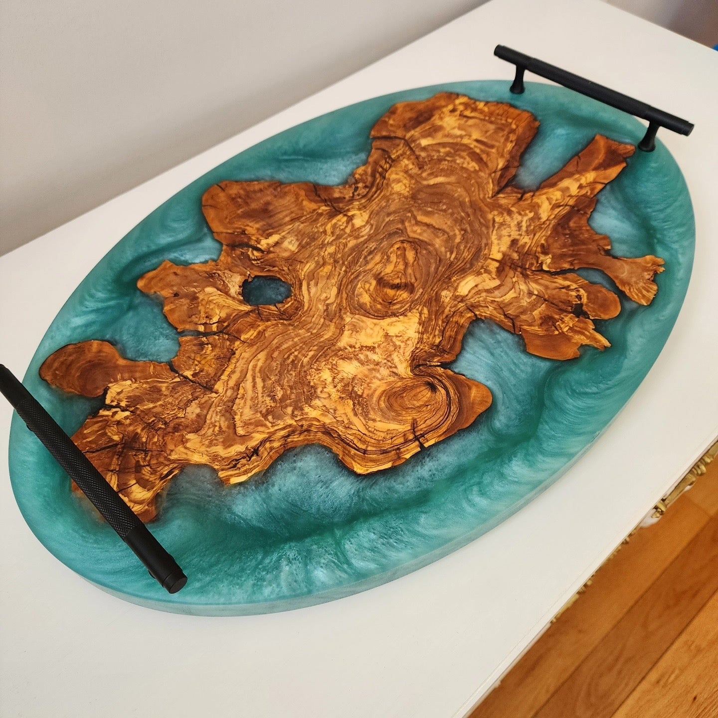 Chunky Live Edge Oval Olive Wood Charcuterie w/ Caribbean Blue Swirl