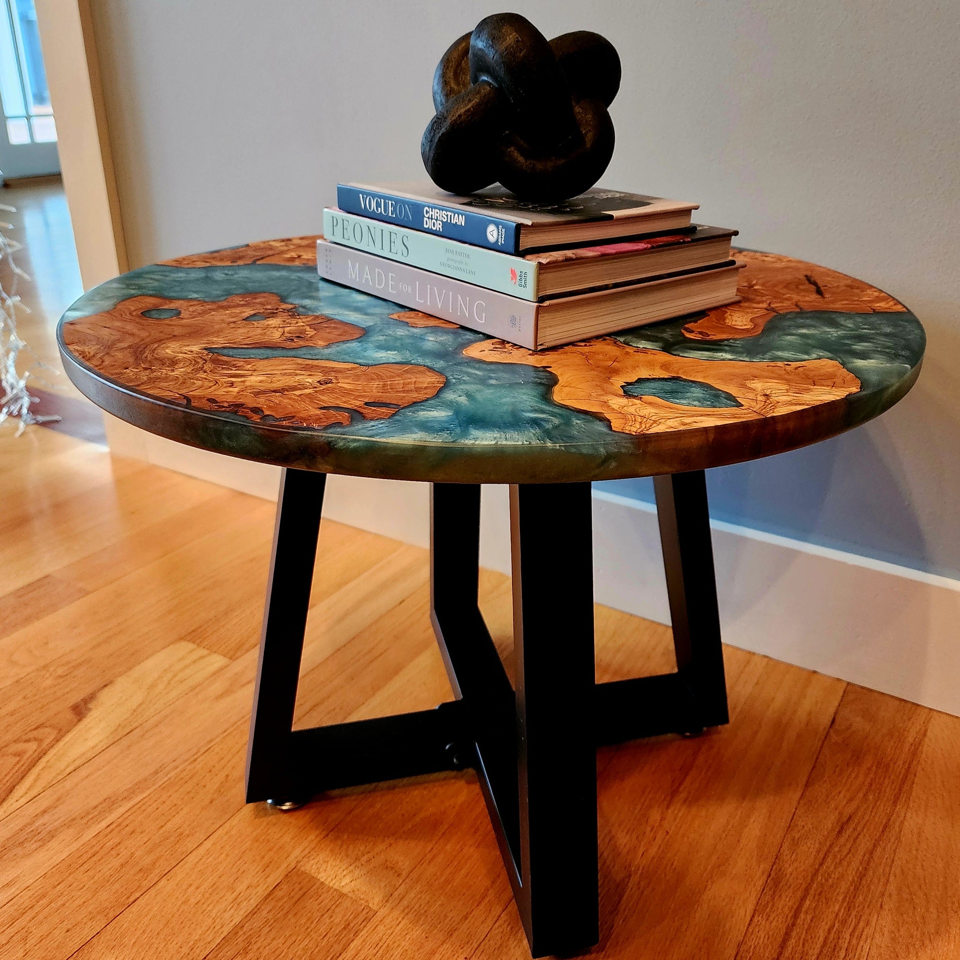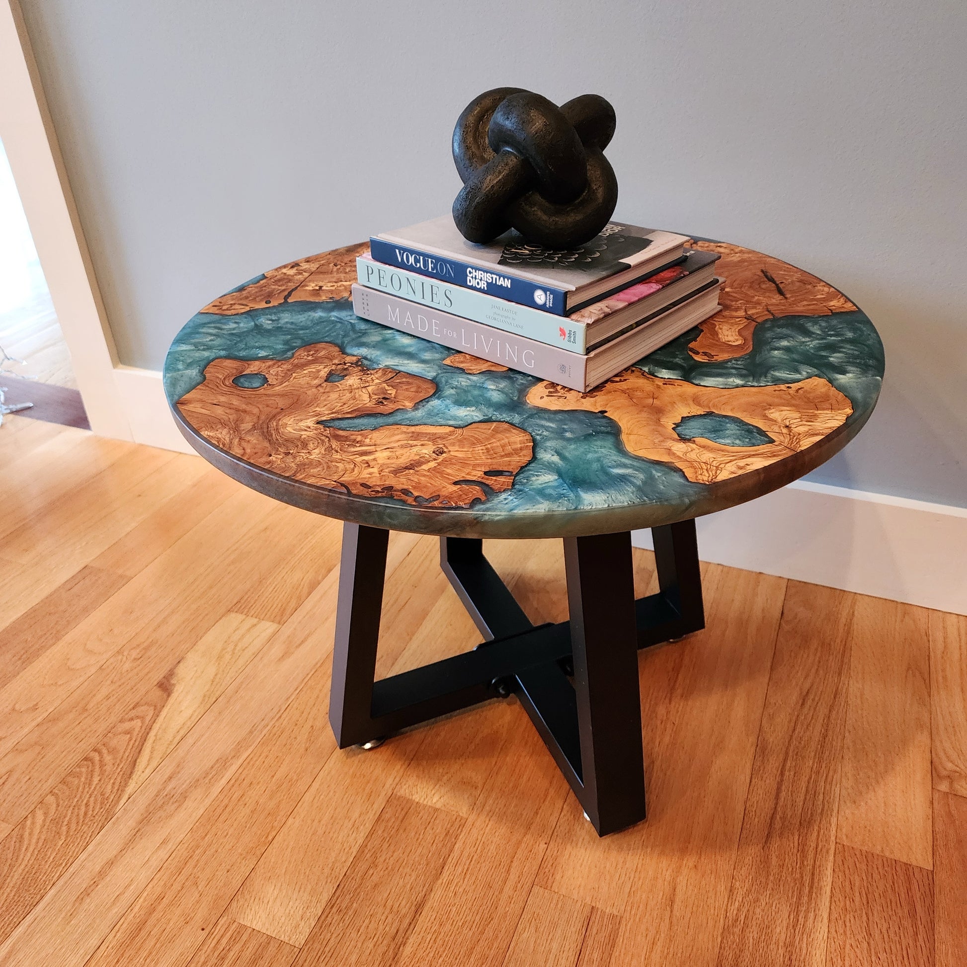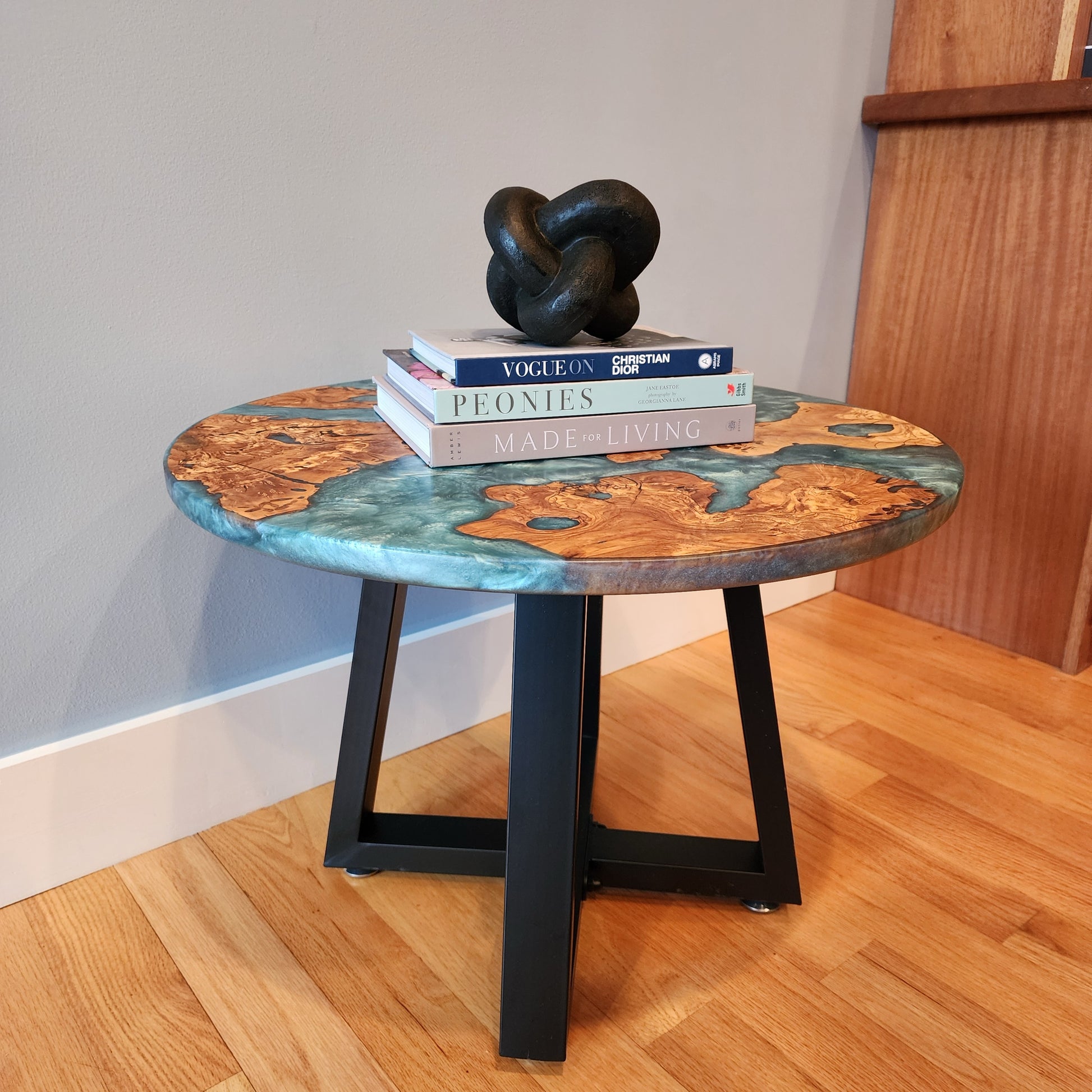 Sold Sample - Olive Wood w/ Venice Blue Swirl. Black Powder Coated Modern Steel Base
