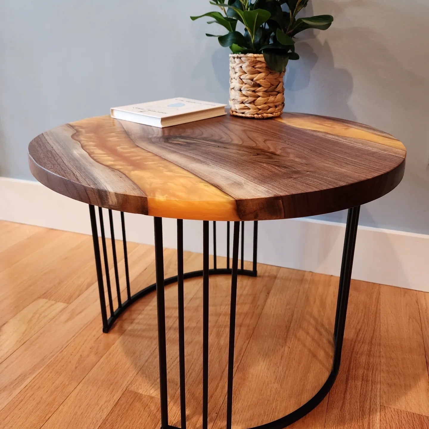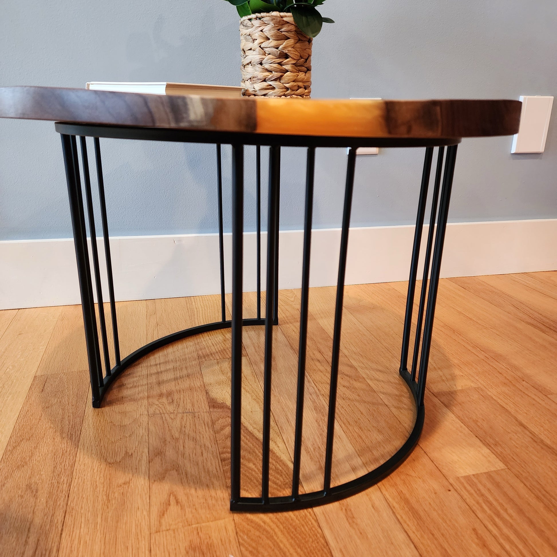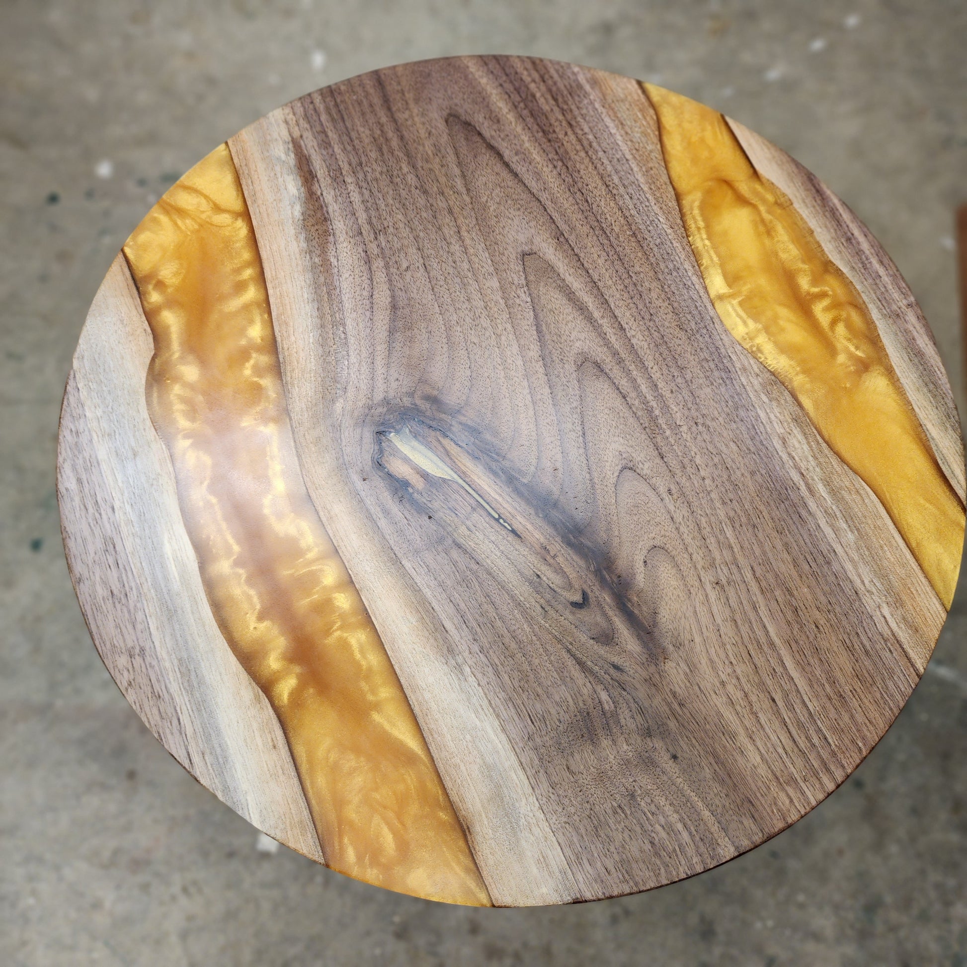 Cherry Live Edge w/ Lux Gold Swirl. Black Powder Coated Modern Steel Round Base.