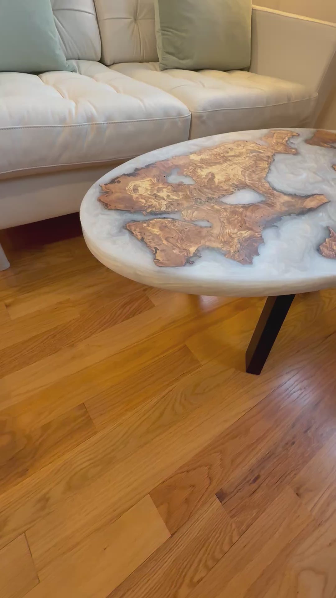 Sold Sample - Handmade Olive Wood Live Edge Oval (Surfboard) Coffee Table w/ Pure White Pearl Swirls.