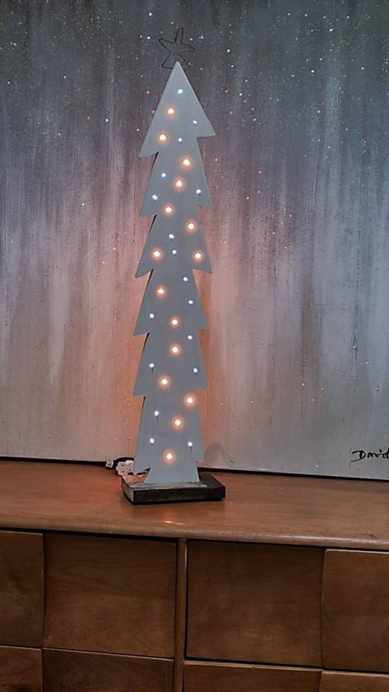 White Washed Blue & White Lit Wood Christmas / Hanukkah Tree with Reclaimed Barn Wood Base, Plug-In Inserted Lights
