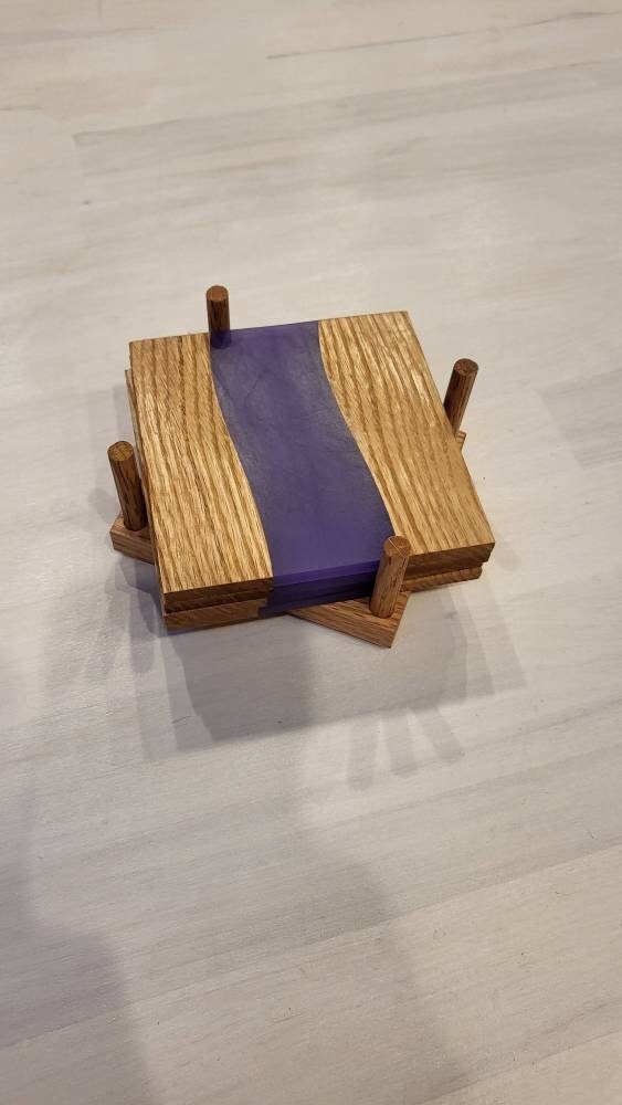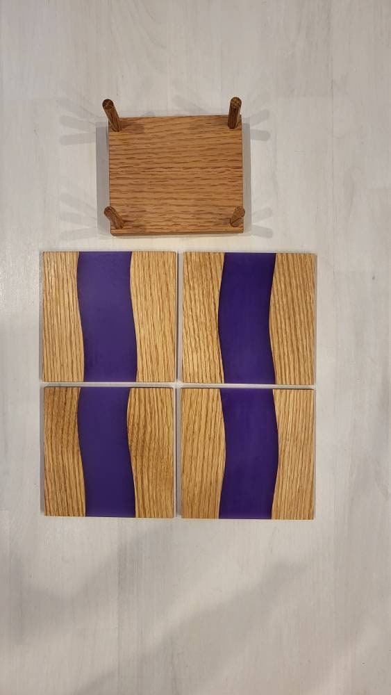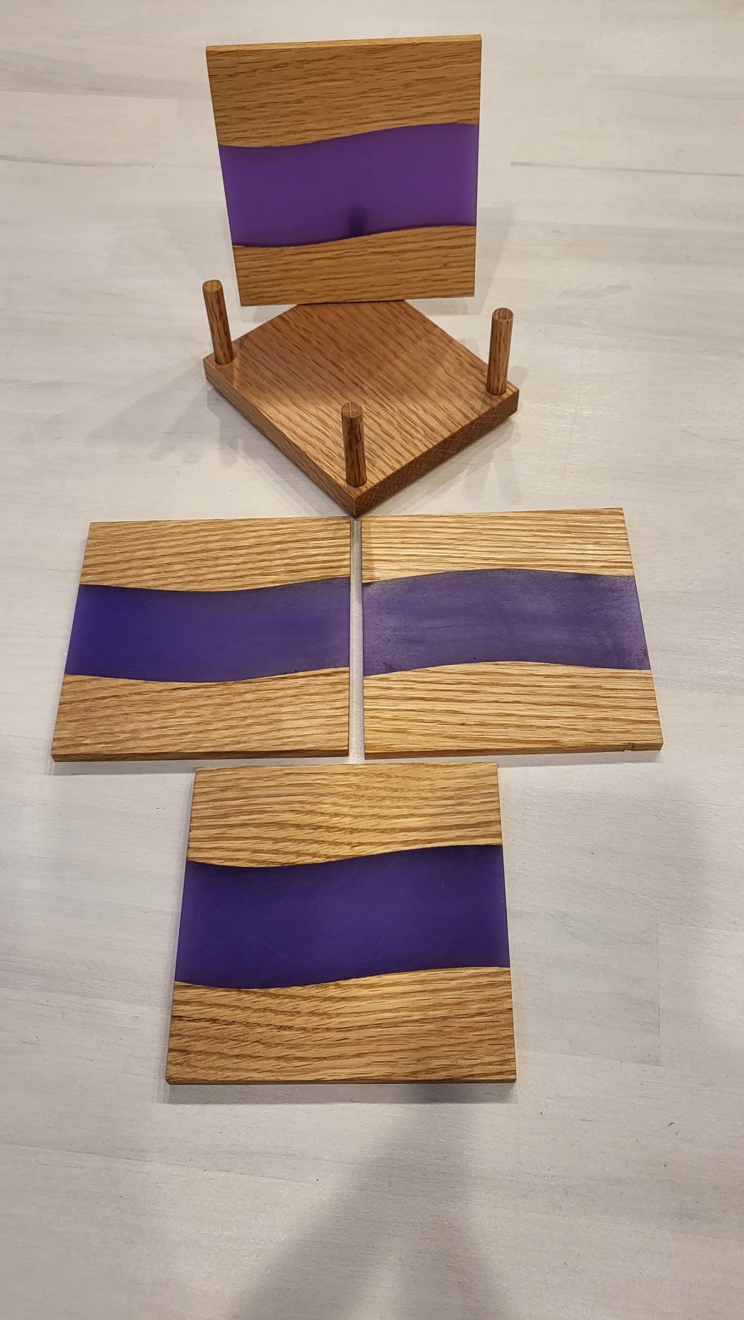 Purple Opaque Epoxy Resin & Red Oak River Coasters w/ Natural Tung Oil Finish.