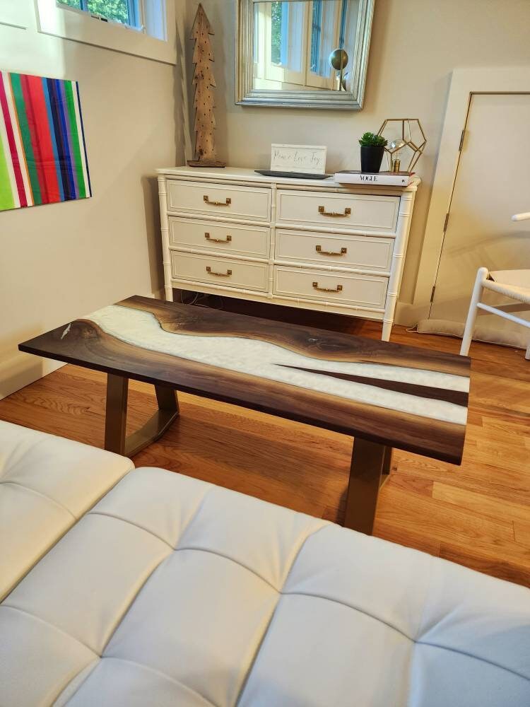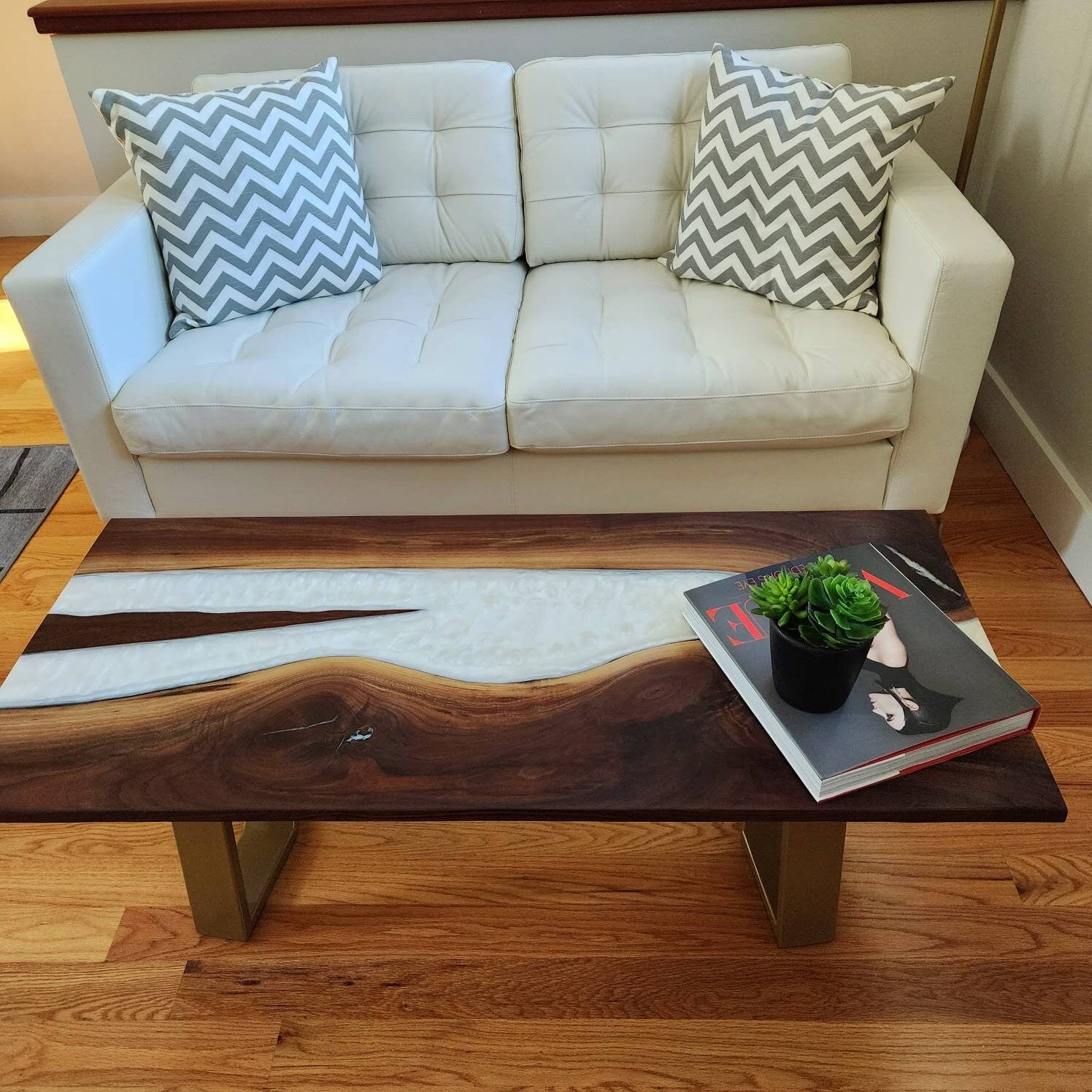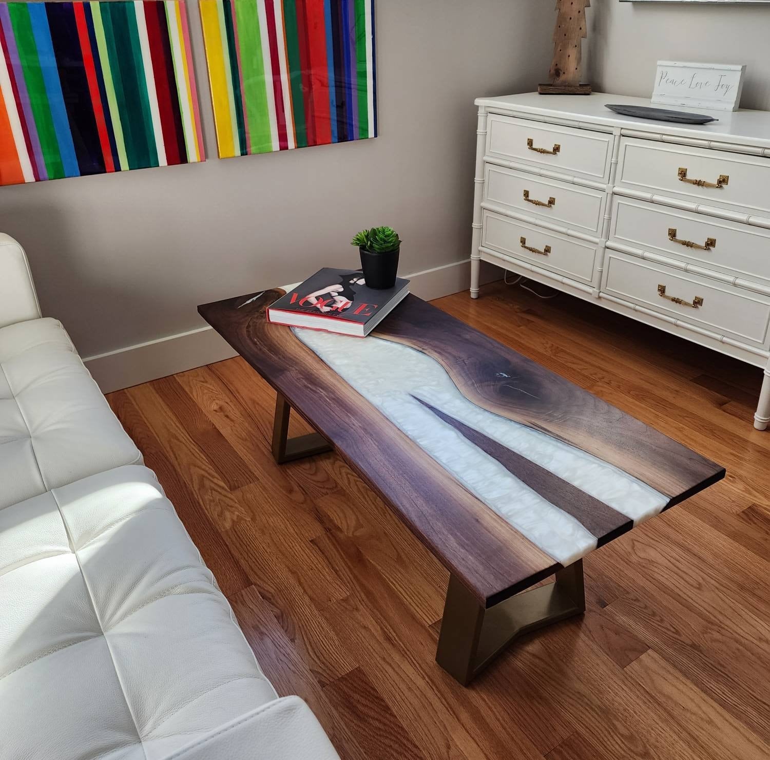 Handmade Black Maple Live Edge River Coffee Table w/ a River of White Pearl Epoxy Resin.