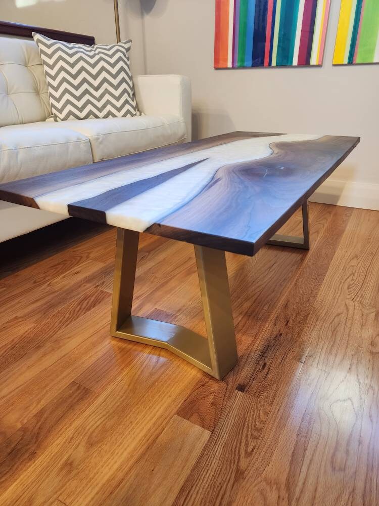 Sold Sample - Handmade Black Maple Live Edge River Coffee Table w/ White Pearl Epoxy